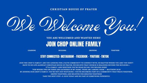 E-join is our way of connecting with you via the internet to grow the body of Christ and continue to advance His Kingdom together. At CHOP our mission has always been to reach the world with the Gospel and that is what we have been doing for 40+ years. While we may not reside in the same geographical location our love for the Lord is the same which is what keeps us connected. E- Join is an extension of affiliation with our ministry. We invite you to watch all of our services, follow us on all social platforms, download our app, as well as received monthly correspondence from us!